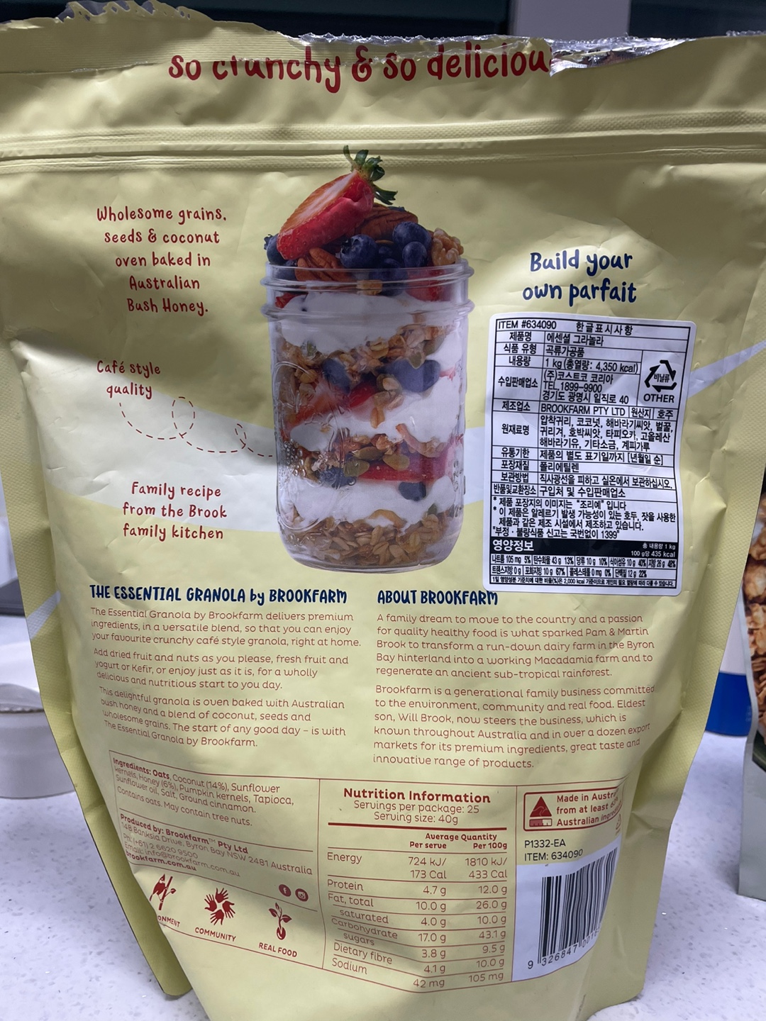 🙇♀️ 코스트코 그래놀라는 호주에서 수입하는 제품인데 친환경 이미지가 있어서 마음에 듭니다. 곡물류는 꿀이나 기타 가루들을 제외하고 압착귀리, 코코넛, 해바라기씨앗 등 6가지가 들어가 있습니다.